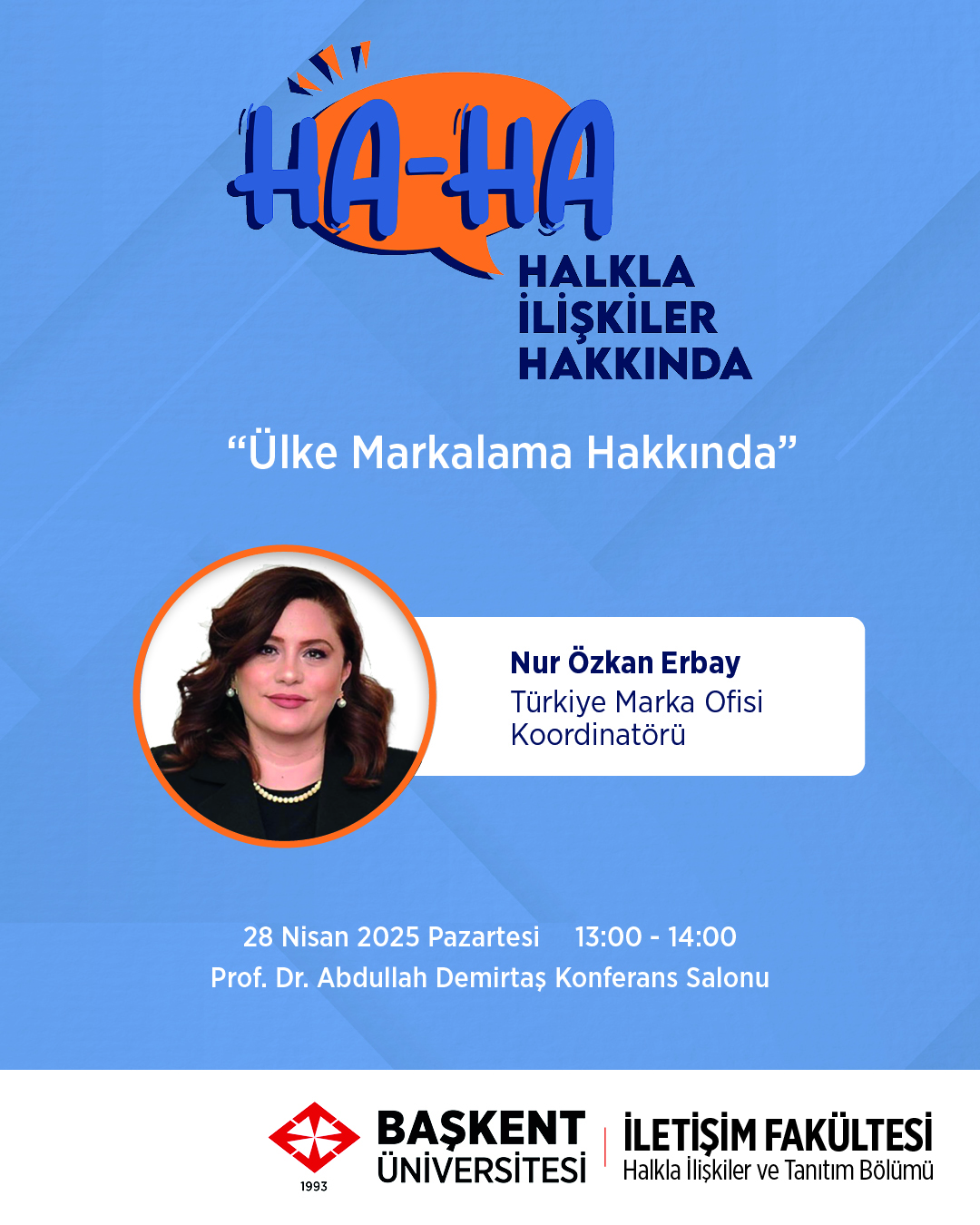 "HA-HA: Halkla İlişkiler Hakkında" etkinliğimizde Türkiye Marka Ofisi Koordinatörü Nur Özkan Erbay'ı ağırlayacağız. 28 Nisan 2025 Pazartesi günü saat 13.00'te Prof. Dr. Abdullah Demirtaş Konferans Salonu'nda gerçekleştireceğimiz etkinliğimize herkesi bekliyoruz!