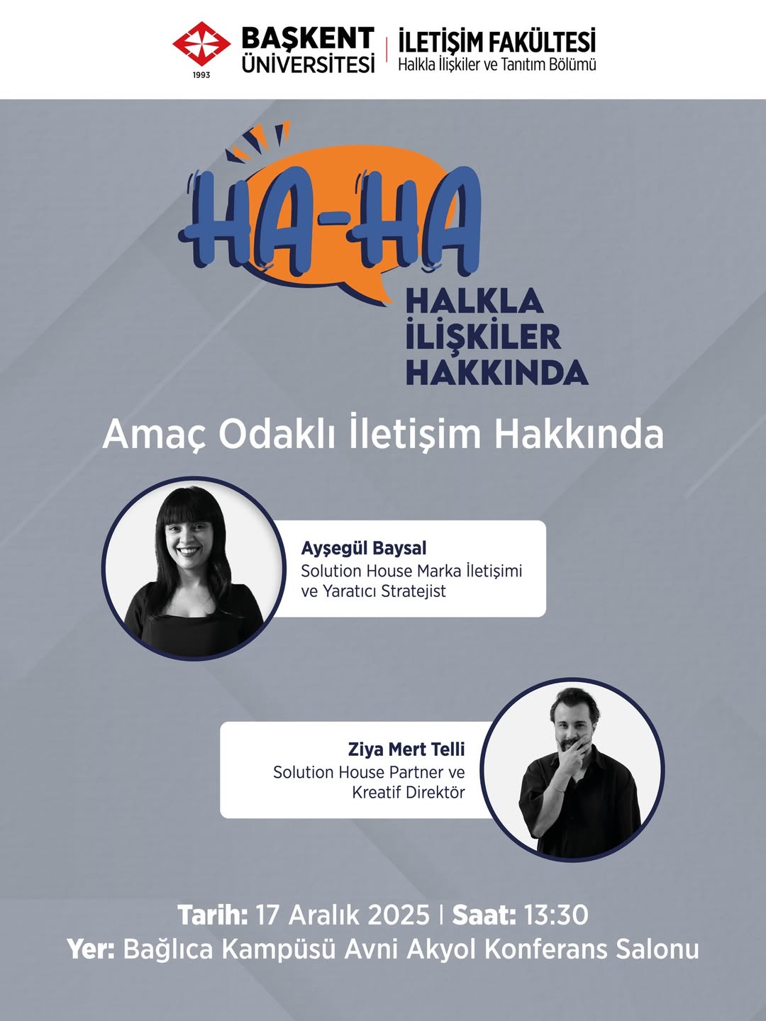 Halkla İlişkiler ve Tanıtım Bölümü olarak düzenli olarak gerçekleştirdiğimiz “HA-HA: Halkla İlişkiler Hakkında” etkinliğinin üçüncüsünde Solution House Marka İletişimi ve Yaratıcı Stratejisti Ayşegül Baysal ile Solution House Partner ve Kreatif Direktörü Ziya Mert Telli'yi ağırlıyoruz!